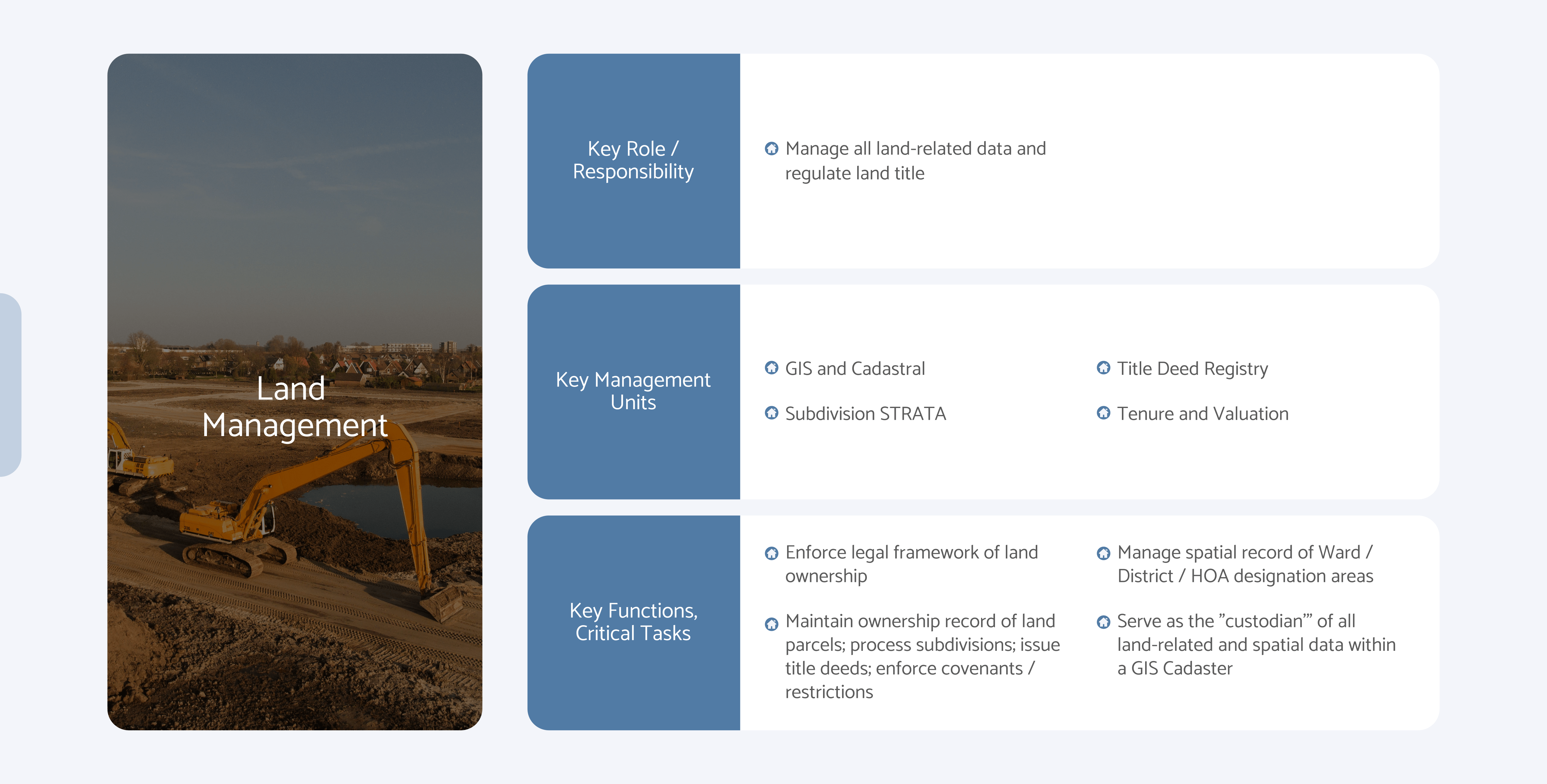 Manage all land-related data and regulate land title
