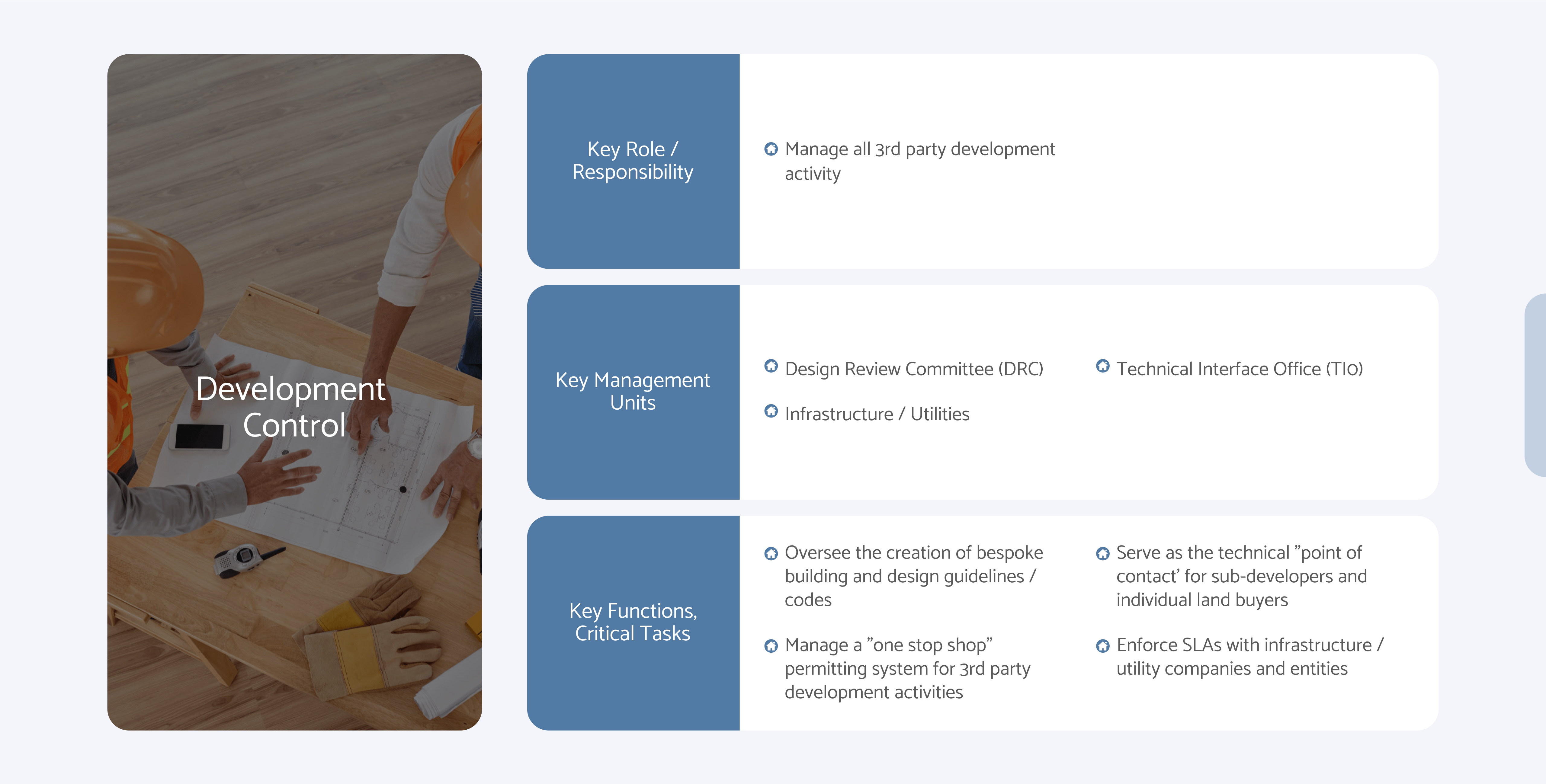 Maintain ownership record of land parcels; process subdivisions; issue title deeds; enforce covenants/ restrictions