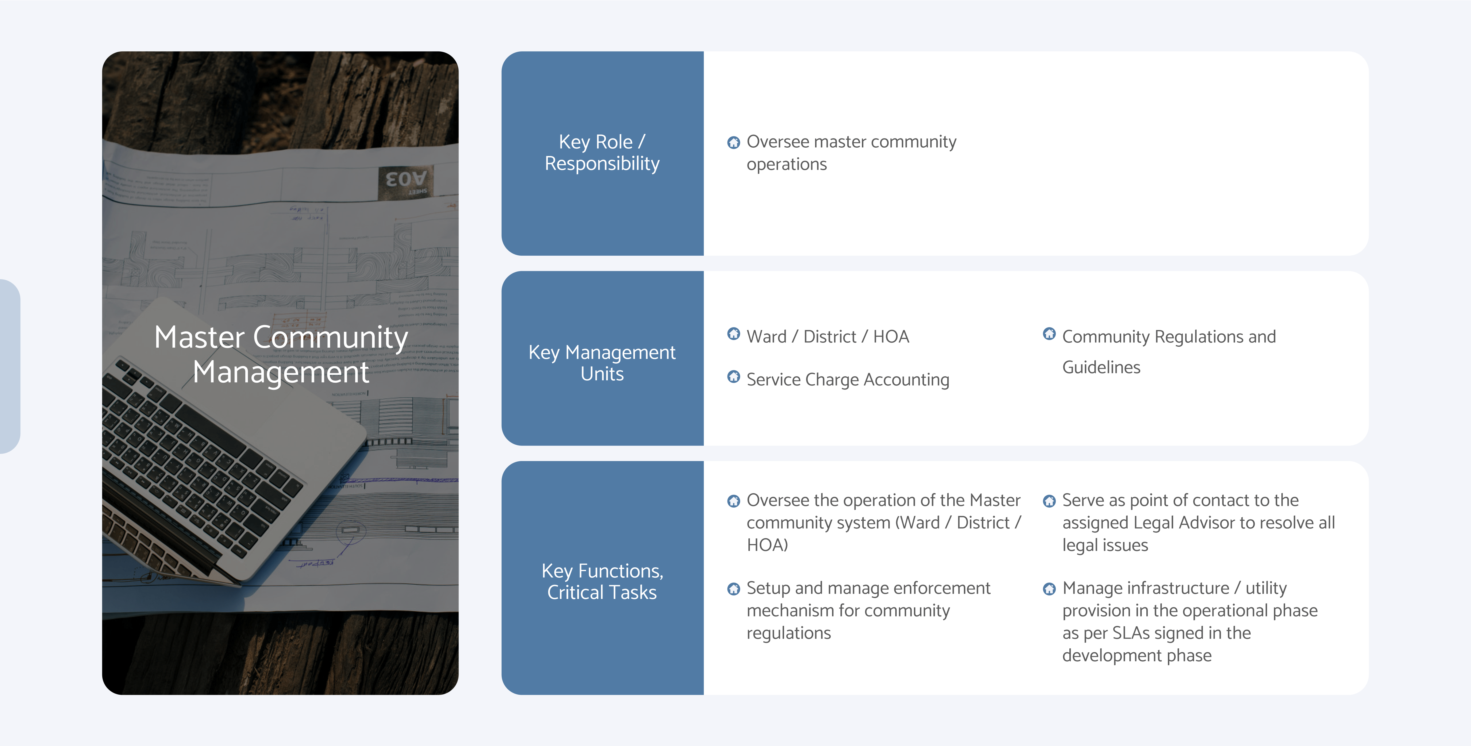 Oversee the operation of the Master community system Ward / District / HOA)